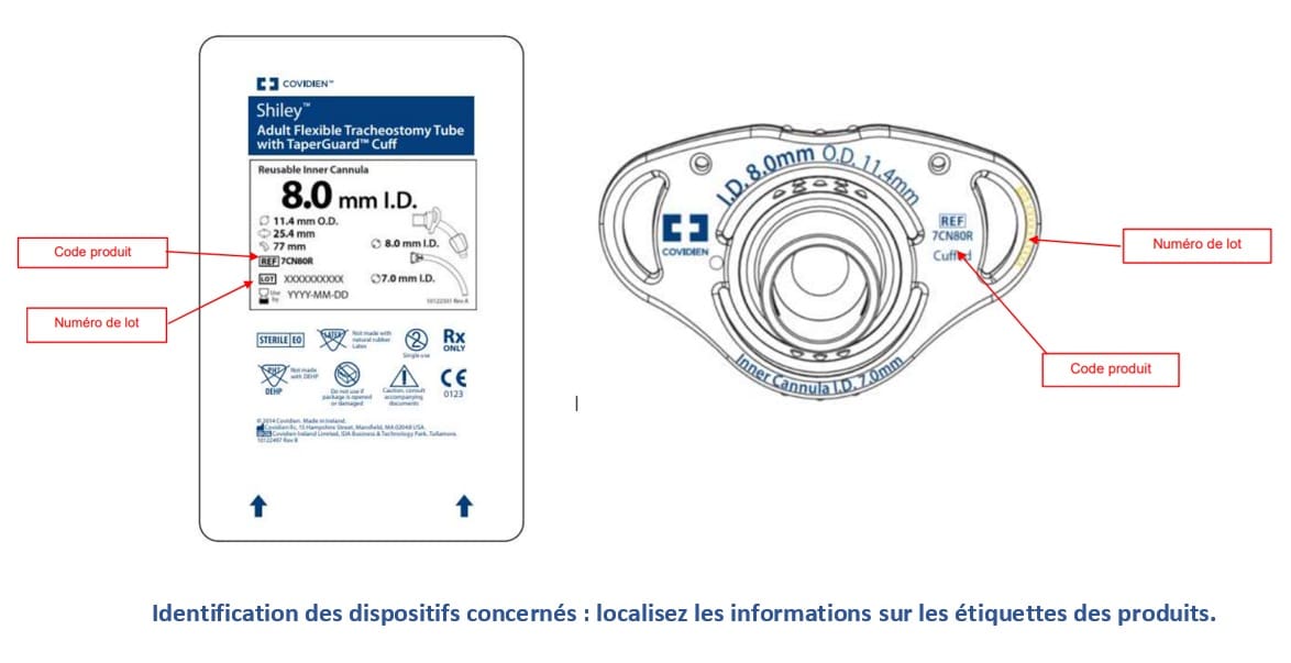 L’ANSM signale un retrait de lot de canules de trachéotomie flexible Shiley pour adultes avec chemise interne réutilisable à ballonnet TaperGuard (lot 202405258X), effectué par la société Covidien LLC et mise en œuvre par Medtronic en France.